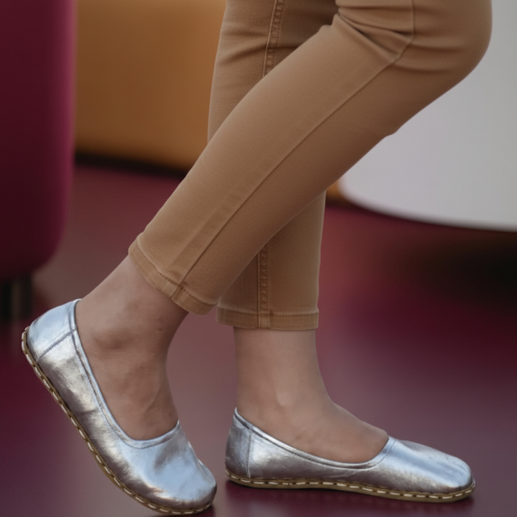 Experience natural movement and timeless elegance with our Handmade Women’s Barefoot Silver Ballet Flats, the perfect blend of minimalist design, barefoot comfort, and everyday versatility.
